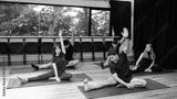 Diverse class of students performing yoga inspired stretches in a modern studio.