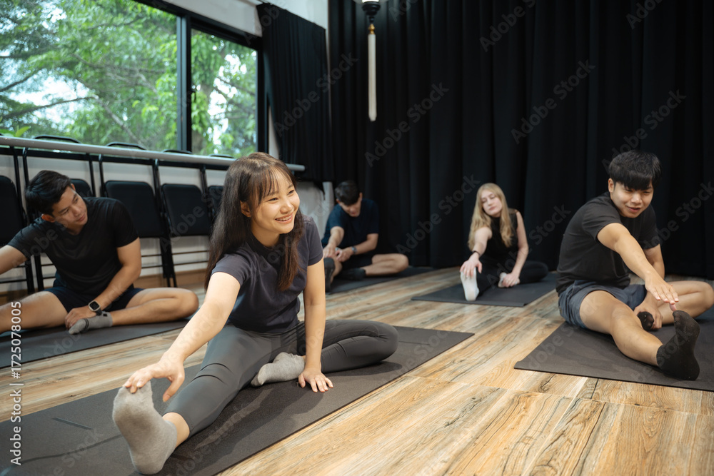 Group of young adults stretching together on yoga mats in a bright fitness studio