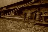 Close up view of vintage train suspension and wheel on rusty railway track