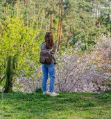 A young woman with a backpack enjoys the beautiful spring scenery, standing amidst vibrant green trees and delicate pink blossoms in a tranquil park. Ideal for themes of travel, nature, and relaxation