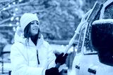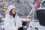 A 30- to 35-year-old woman in a white jacket and hat joyfully and with a smile on her face cleans the stuck snow and ice from her car, getting ready for a trip, against the background of a forest