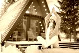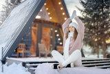 Serene Winter Solitude: Woman Meditating in Lotus Position Amid Snowy Forest Near Her Cozy Cabin During Peaceful Christmas Season