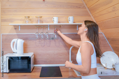 A woman in white clothes takes wine glasses from a shelf in a bright wooden kitchen at home and listens to music. Perhaps she is going to celebrate an event soon - new year or Christmas