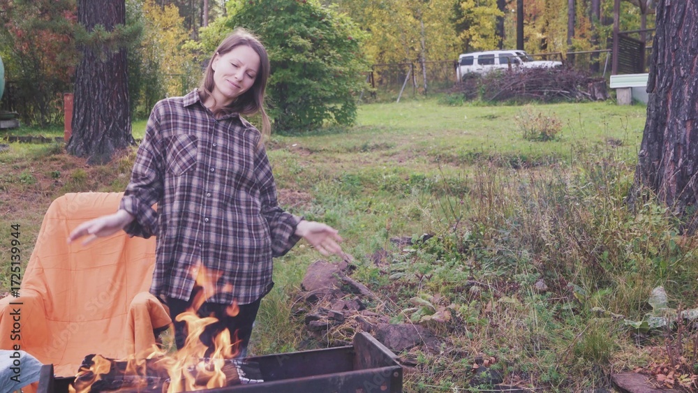 woman relaxes outdoors during autumn, enjoying a picnic by a warm fire. Colorful leaves surround her as she engages with the fire. peaceful atmosphere of nature enhances the cozy vibe of the picnic.