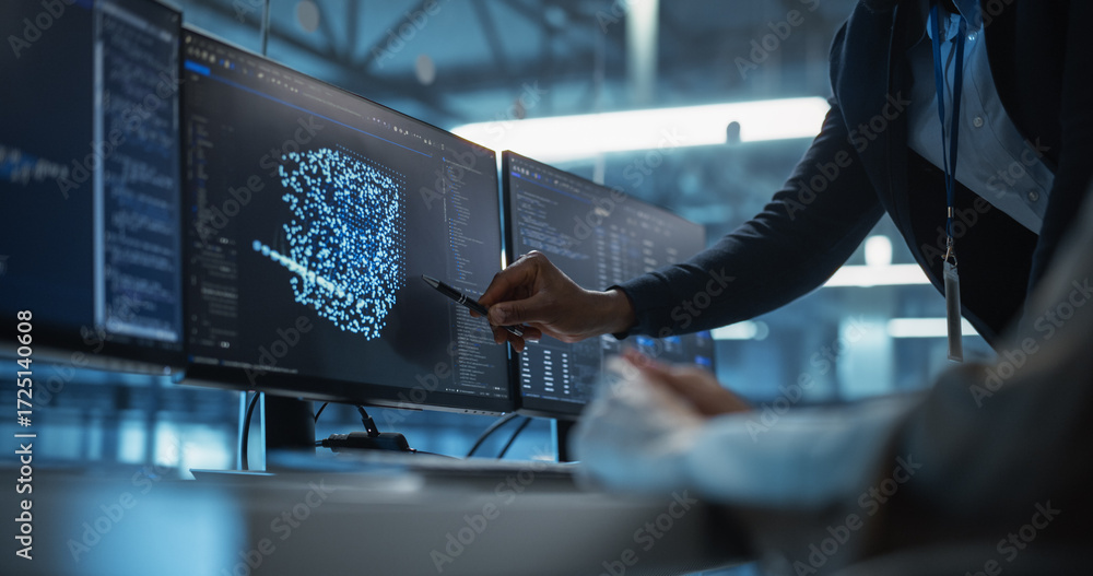 With Screen Setup Showing AI Code and Model Visualization, Female Developer Works Closely with a Black Team Leader Standing Beside Her, Discussing Improvements and Refinements to Their AI System