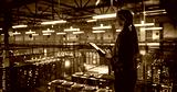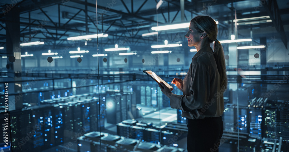 Female Cybersecurity Expert Standing with Her Back to Camera, Works on Her Tablet in a Modern Facility, Running Diagnostic Tests to Identify Network Vulnerabilities in a Data Center with Server Racks