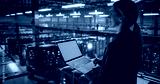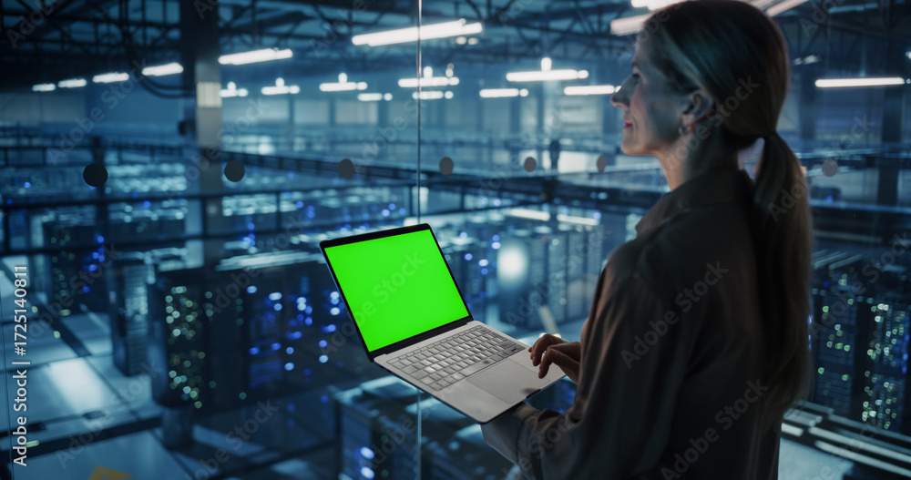 Female Information Technology Engineer Using Her Laptop Computer with Green Screen Chroma Key Display in a High-Tech Data Center, Analyzing Potential Risks to Ensure Network’s Safety and Compute Power