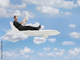 Businessman sitting on a plane and reading a newspaper