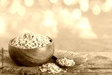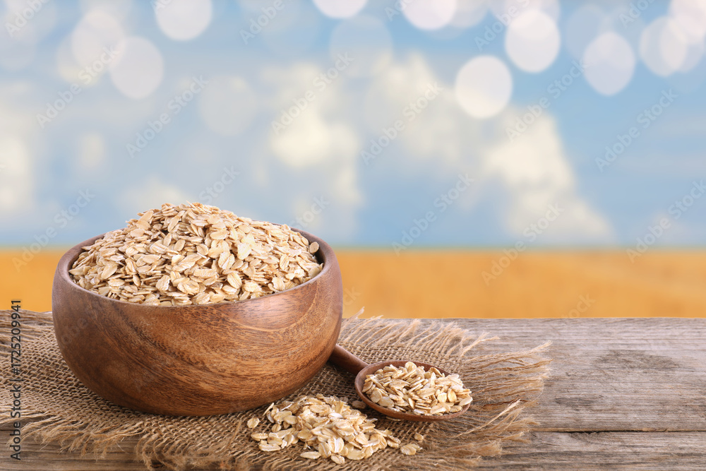 Rolled oats on wooden table against cereal field, bokeh effect