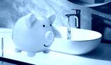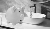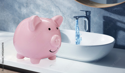 Save water concept. Piggy bank near sink and tap with dripping water
