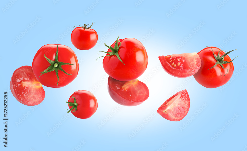 Fresh ripe tomatoes flying in air against light blue background