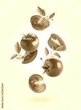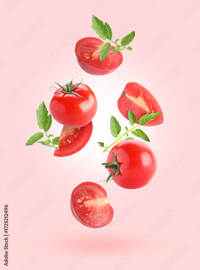 Fresh ripe tomatoes and green leaves falling against pink background