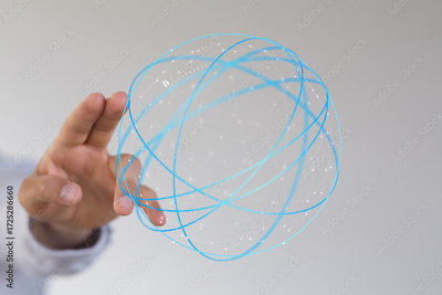Hand interacting with a digital globe, representing connection, technology, and global network.