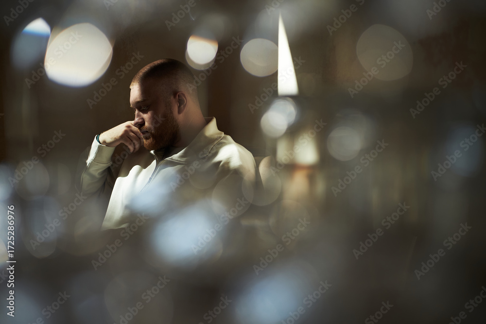Caucasian young adult man sitting with hand resting on face, appearing deep in thought, short hair and trimmed beard visible, blurred foreground elements framing subject