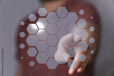 Abstract technology background. Person interacting with futuristic hexagonal interface. Innovation concept.