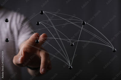 Hand interacting with a digital network. Conceptual image for technology, connection, and global communication.