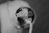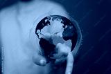 Hand interacting with digital globe, showcasing global network, technology, connection, and innovation.