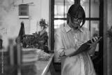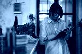 Caucasian young adult woman with glasses standing indoors writing on clipboard, focused expression, visible tattoo on arm, short hair, working near counter with potted plant