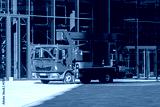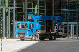 Blue truck-mounted aerial work platform parked in front of a modern glass building