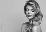 Beautiful laughing blonde model girl with long curly hair . Smiling woman hairstyle wavy curls . Fashion , beauty and makeup portrait