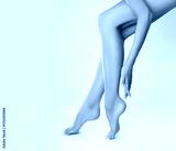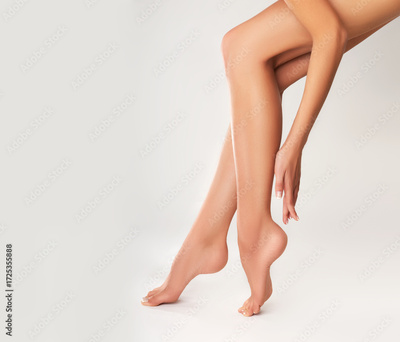 Perfect clean female feet . Beautiful and elegant groomed girl's hand touches her feet . Spa ,scrub and foot care . Woman legs