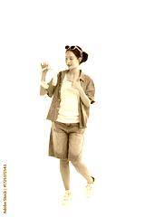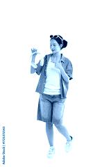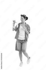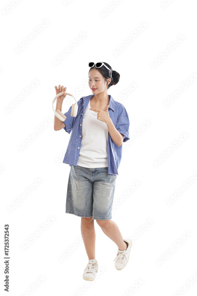 A young woman, dressed in casual attire, joyfully presents her headphones. Her cheerful expression suggests excitement and anticipation.