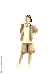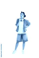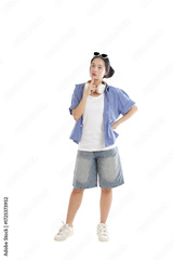 Thoughtful Reflection: A young woman, radiating casual sophistication, is lost in thought against a clean backdrop. She holds her chin as if contemplating some important idea.