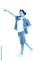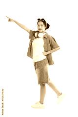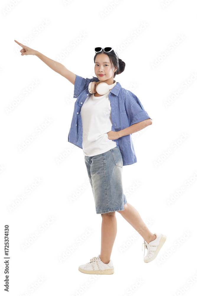 Journey's Guide: A vibrant and enthusiastic young woman strikes a pose, pointing confidently with a pair of sunglasses atop her head and headphones around her neck.