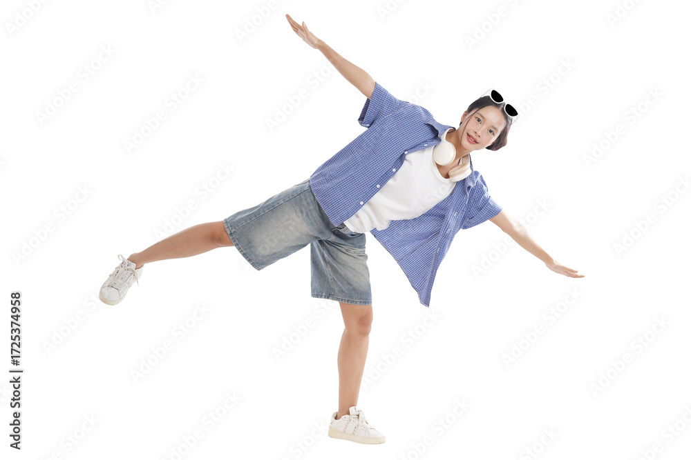 A Moment of Joy: A young woman balances, arms outstretched, capturing a carefree moment of freedom. a blend of youthful energy and joyful motion.
