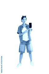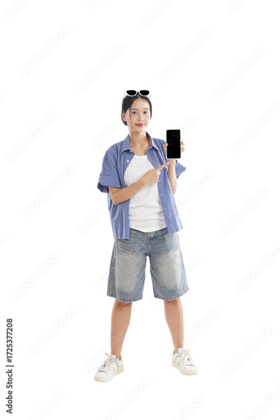 Modern Tech Display: A casual young woman confidently presents a sleek mobile phone, her posture radiating contemporary tech-savviness against an unobtrusive backdrop.