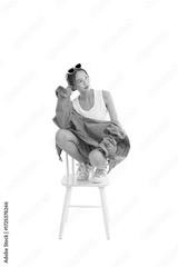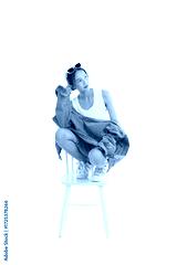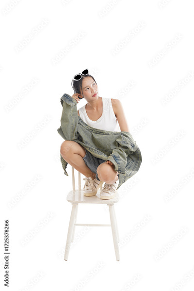 Relaxed Moment: A young woman dressed in casual attire perches on a wooden chair, a picture of ease and contemplation, inviting you into her world of quiet introspection.