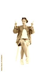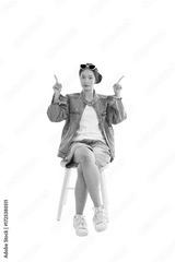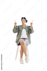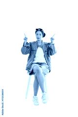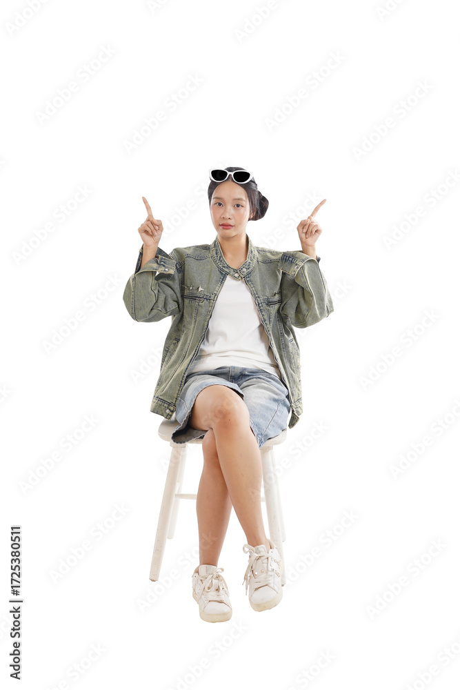 Fashion Forward Woman: A stylish woman in casual attire seated on a stool, exuding confidence and pointing upwards, with a focus on fashion, style, and a dynamic upward gesture.