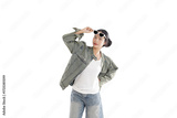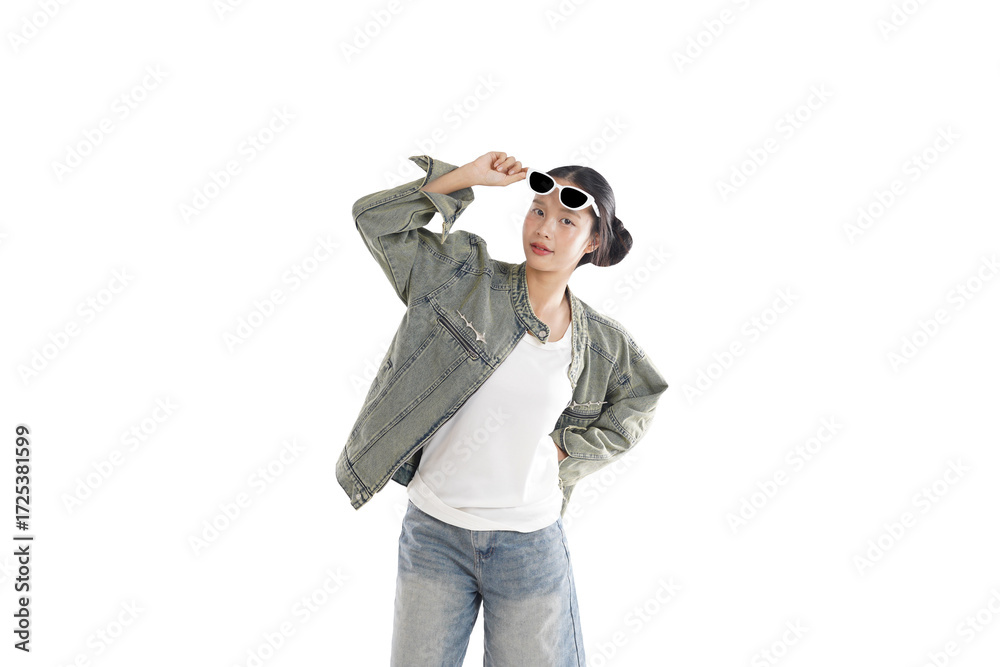 Stylish Woman with Sunglasses: A fashionable woman in a green jacket and blue jeans, stylishly holding her sunglasses. A picture of modern charm and confident poise.