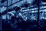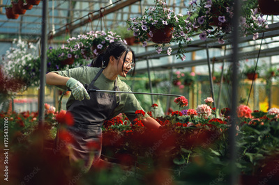 Asian woman working in greenhouse watering flowers.