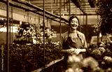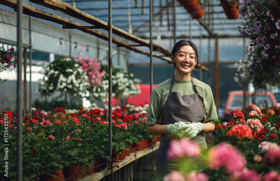 Portrait of Asian woman in flowers greenhouse looking at camera.