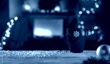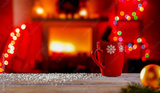 Festive holiday interior with warm Christmas and winter accents, cozy decorations and joyful atmosphere. Table with copy space for product placement or text. Christmas marketing, seasonal advertising.