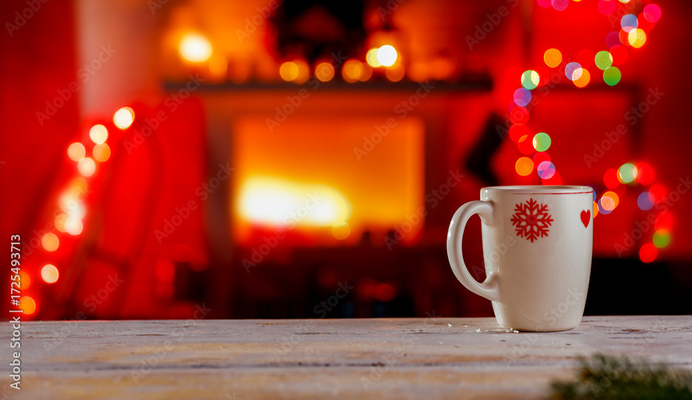 Festive holiday interior with warm Christmas and winter accents, cozy decorations and joyful atmosphere. Table with copy space for product placement or text. Christmas marketing, seasonal advertising.