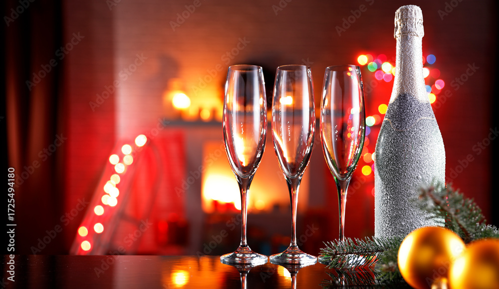 Festive holiday interior with warm Christmas, New Year, winter accents, cozy decorations, joyful atmosphere. Copy space for product placement or text. Christmas marketing, seasonal advertising.