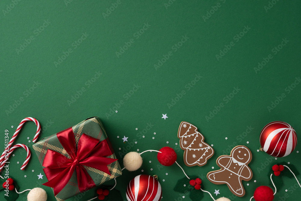 Vibrant Christmas celebration scene featuring a wrapped gift with red ribbon, candy canes, gingerbread cookies, and ornaments on a green background, evoking festive cheer gifts and holiday greetings