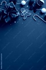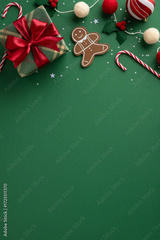 A vertical Christmas scene featuring a wrapped gift with red bow, a gingerbread man, candy canes, and festive ornaments on a green backdrop for holiday cheer and seasonal promotion