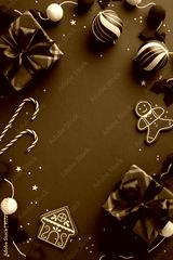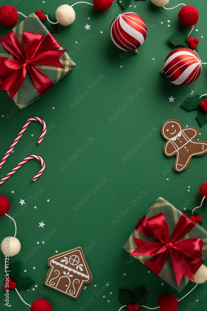 Green vertical backdrop hosts festive gifts, cookies, candy canes, gingerbread, ornaments, and ribbons ready for Christmas and New Year greetings