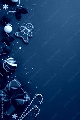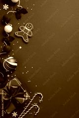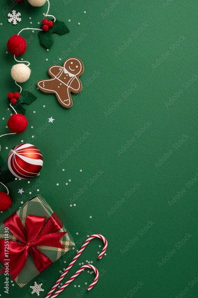 Festive vertical holiday scene featuring decorations, gingerbread, candy cane and wrapped gifts arranged along a green backdrop, creating a warm Christmas and New Year greeting vibe