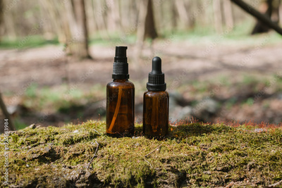 A dark and light glass serum bottle with a dropper, tree bark wood, moss. forest on a sunny day nature background. Concept of skin care, hydration, cosmetic demonstration eco-friendly product mock up