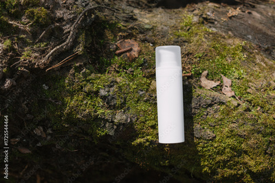A dark and light glass serum bottle with a dropper, tree bark wood, moss. forest on a sunny day nature background. Concept of skin care, hydration, cosmetic demonstration eco-friendly product mock up