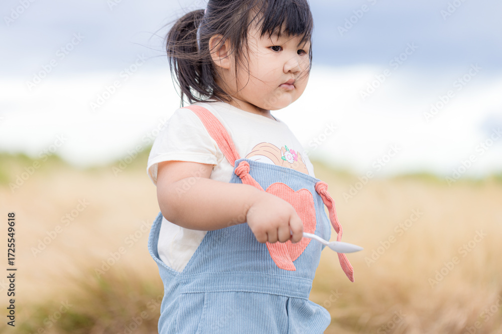 A cute little Asian girl is running in a brown grass field outdoors in summer,Girls running in a beautiful park. Girls running and having fun in the park. Park adventures: Girls playing.