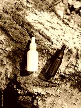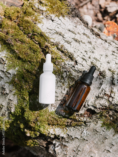 A dark and light glass serum bottle with a dropper, tree bark wood, moss. forest on a sunny day nature background. Concept of skin care, hydration, cosmetic demonstration eco-friendly product mock up
