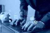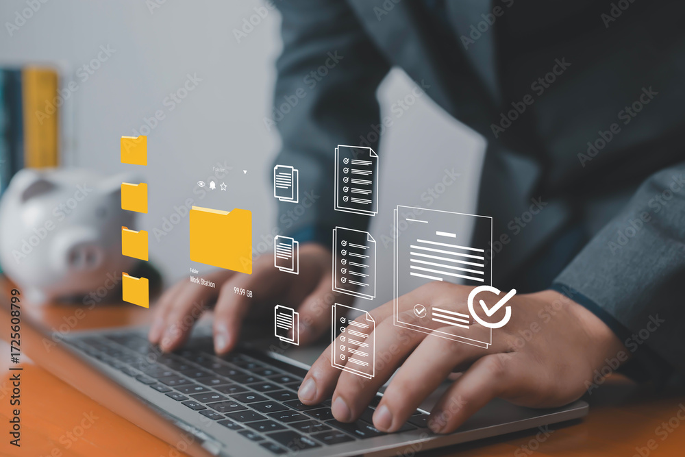 Businessman managing digital folders and documents on laptop with virtual interface, symbolizing cloud storage, data management, organization, workflow, and modern technology solutions.
