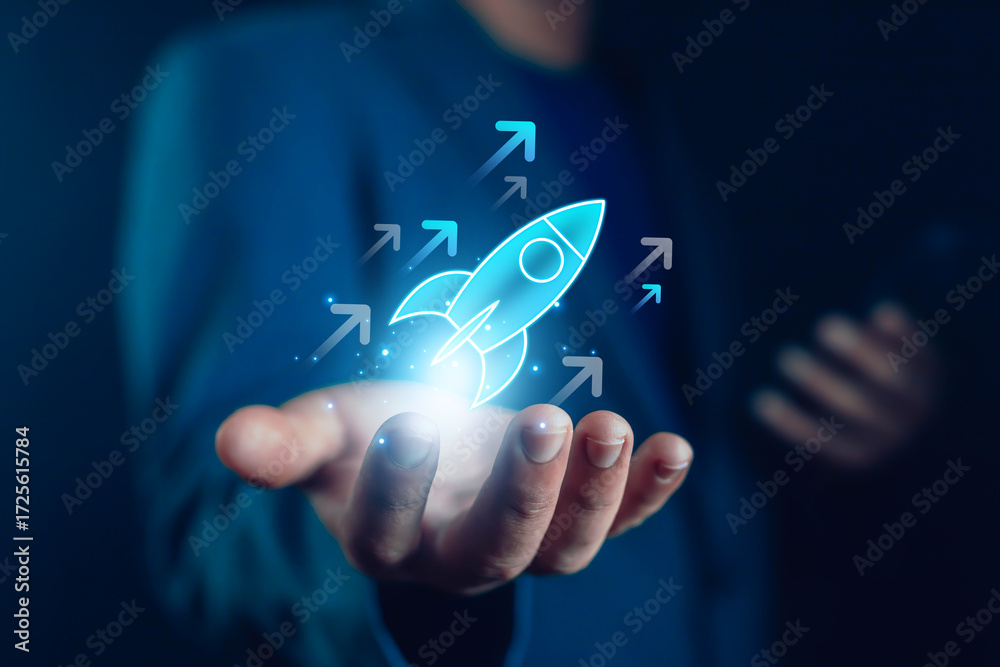 Businessman holding glowing digital rocket icon with upward arrows, symbolizing startup growth, innovation, entrepreneurship, success, and future business opportunities symbolizing entrepreneurship,