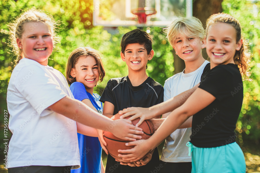 teens in sportswear playing basketball game outside together