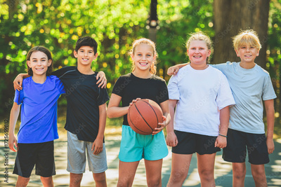 teens in sportswear playing basketball game outside together